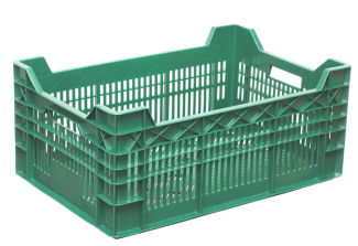 Пластиковый перфорированный ящик для транспортировки и хранения овощей и фруктов. Применяется также под хлеб и хлебо-булочные изделия.